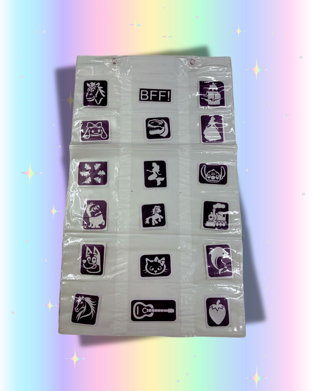 Our glitter tattoo stencil display bag is perfect for showing your selection of temporary tattoos at your parties and events.