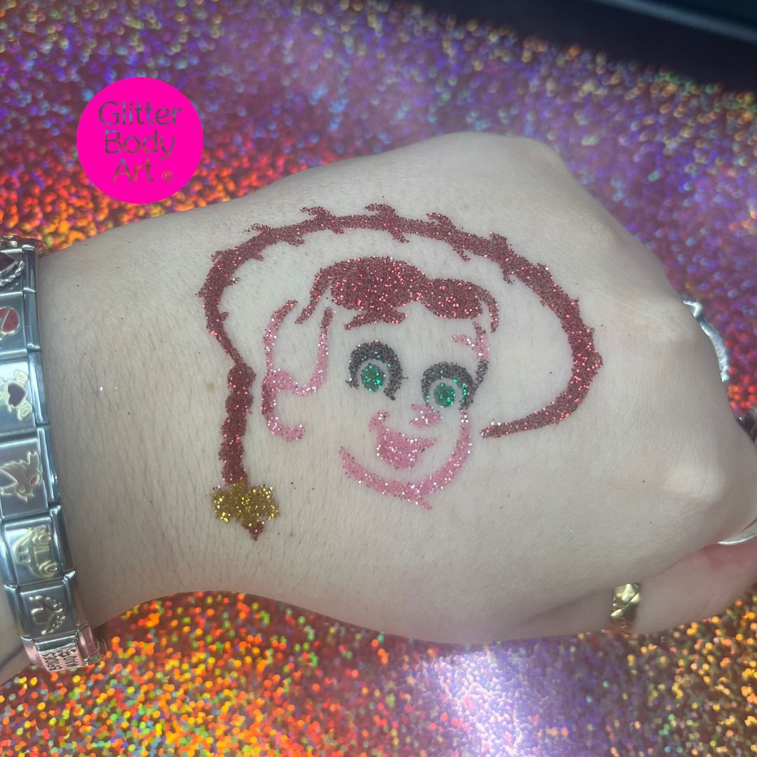 Toy Cowgirl Tattoo stencil for creating sparkly glitter tattoos for your Toy Story Birthday theme.