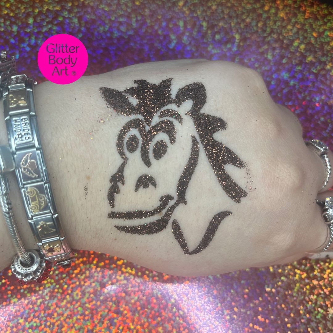 Toy Horse Tattoo stencil for creating sparkly glitter tattoos for your Toy Story Birthday theme.